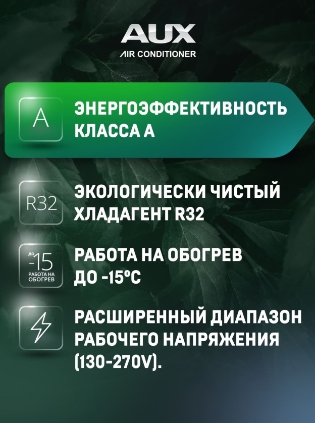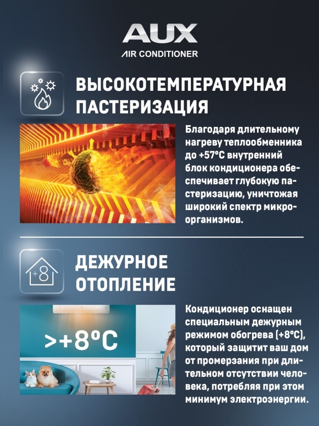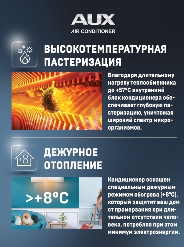 ● Все новые модели кондиционеров AUX оснащены специальным дежурным режимом обогрева (+8°C), который защитит ваш дом от промерзания при длительном отсутствии человека, потребляя при этом минимум электроэнергии.