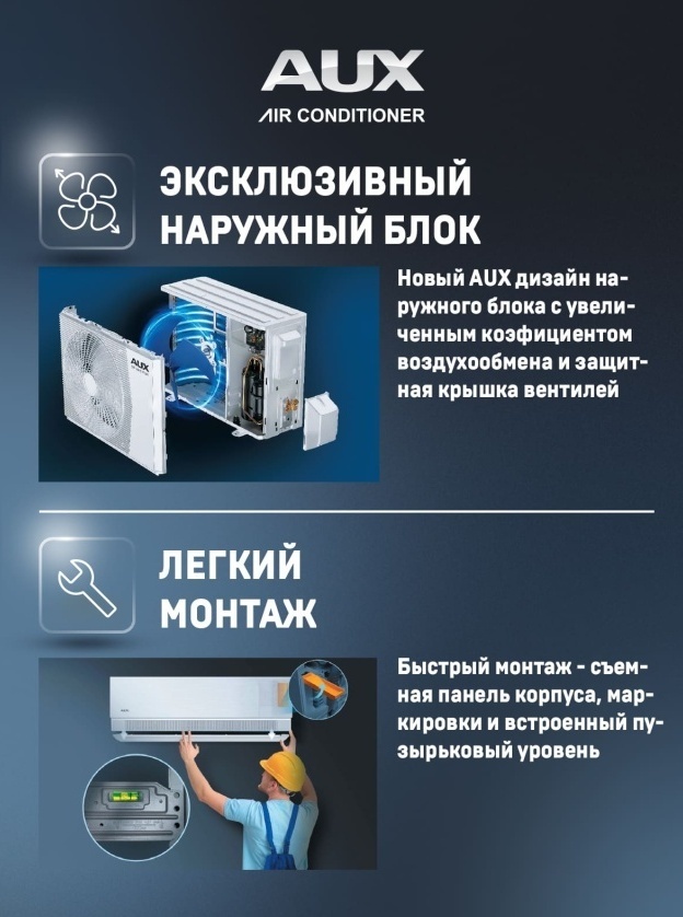 ● К 30-летию компания AUX представила эксклюзивный наружный блок с оптимизированной конструкцией. Увеличенная на 10 мм круглая решетка вентилятора повысила эффективность воздухообмена на 10%. Вертикальное расположение основной платы обеспечивает надежную защиту от механических повреждений и загрязнений.