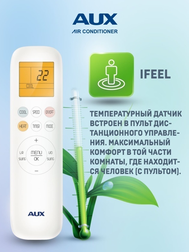 ● Функция iFeel. Температурный датчик встроен в пульт дистанционного управления. Блок автоматически выберет режим работы, чтобы достичь максимально комфортной температуры в той части комнаты, где находится человек