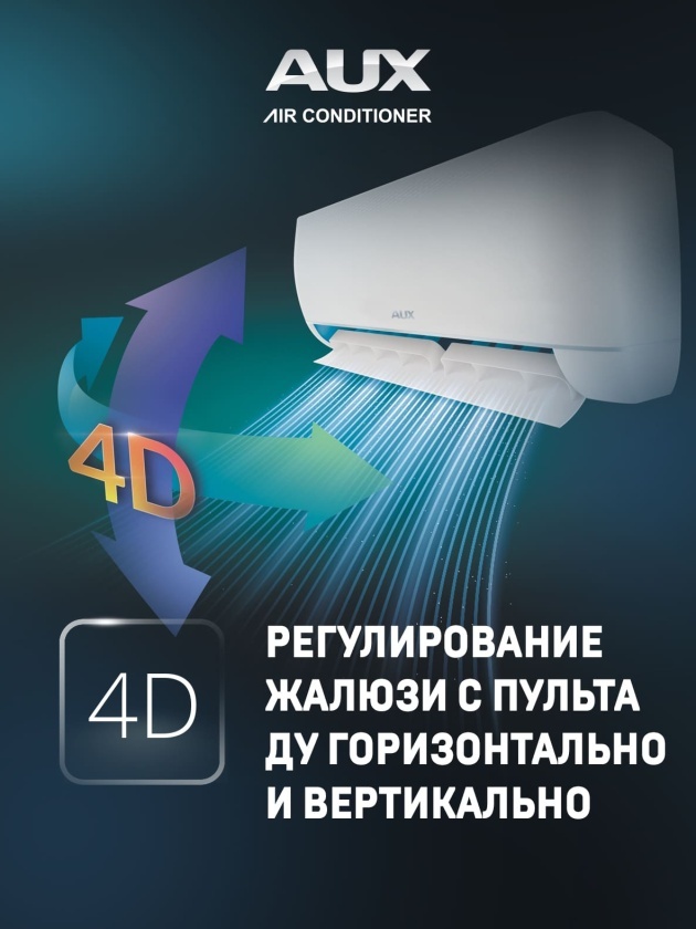 ● 4D обдув. Благодаря электроприводу вертикальных и горизонтальной жалюзи возможно управлять воздушным потоков в 4-х направлениях с пульта ДУ